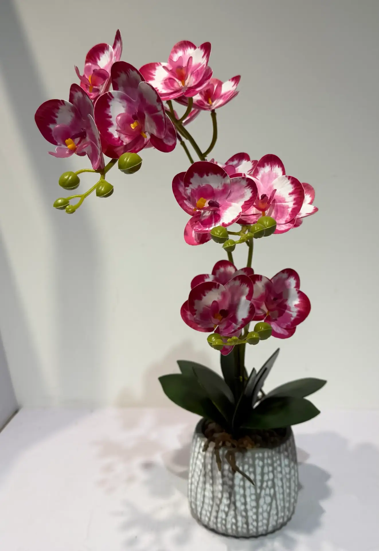 Materiales que Engañan a la Vista: Pétalos de seda y poliéster premium con una textura aterciopelada y un brillo sutil. Las hojas verdes y carnosas completan la ilusión de una orquídea viva y saludable.