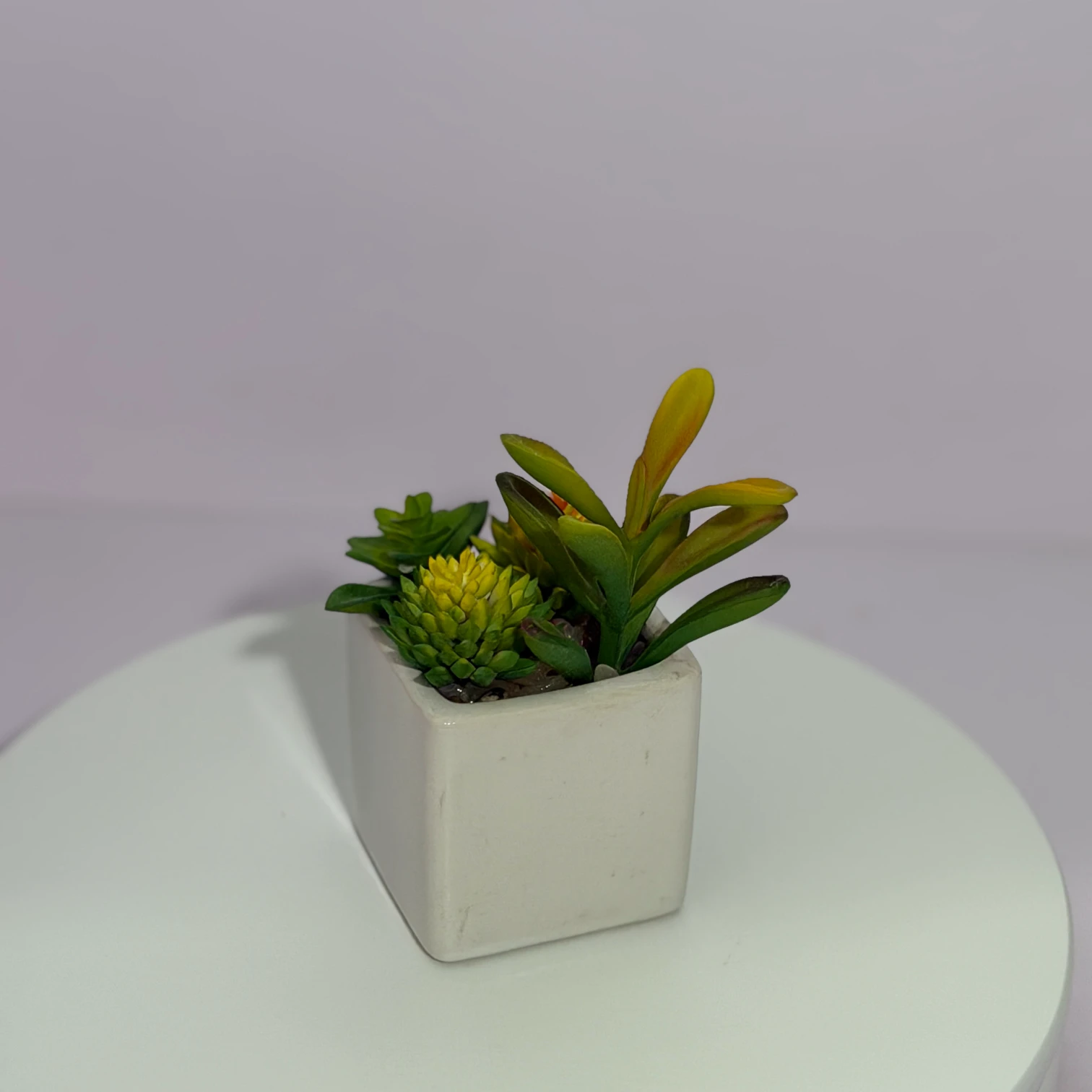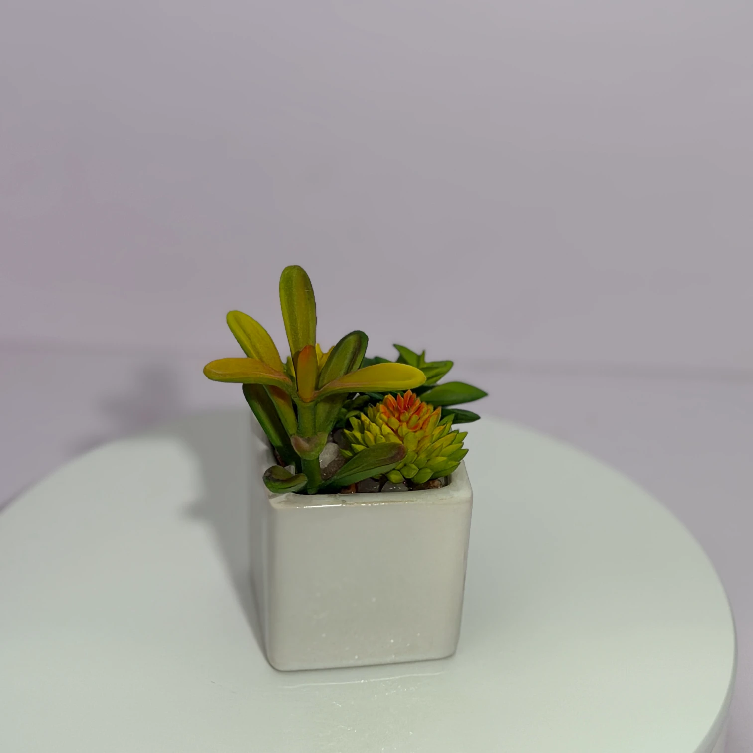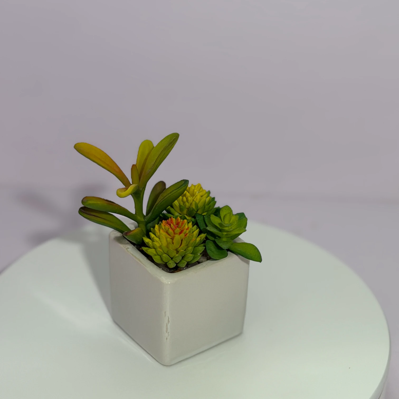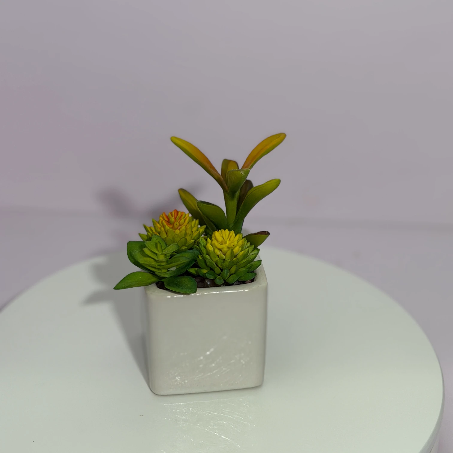 Este arreglo de suculentas artificiales combina diversas especies en tonos verdes y amarillos, incluyendo dos suculentas en forma de piña (una con toque rojizo en el centro), montado en una maceta cuadrada blanca de cerámica. Totalmente artificial, no necesita riego, luz solar ni cuidados, aportando un toque de naturaleza fresca y elegancia minimalista a escritorios, mesas o rincones del hogar.