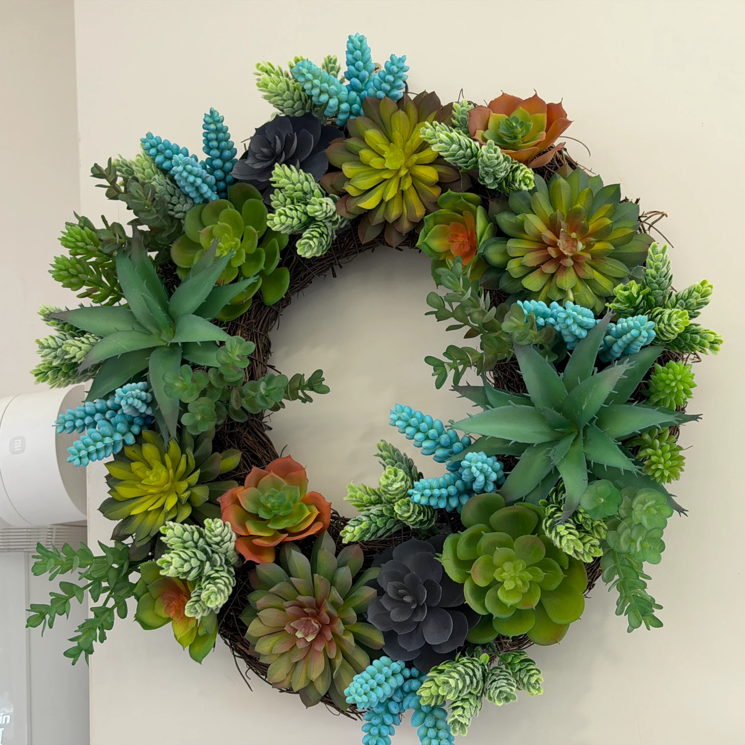 Esta corona de suculentas artificiales está compuesta por una variedad de especies en tonos de verde, azul, rojo y negro, montada sobre una base de mimbre. Totalmente artificial, no necesita riego, luz solar ni cuidados, aportando un toque de naturaleza exuberante y encanto rústico a puertas de entrada, paredes o decoración de mesas.