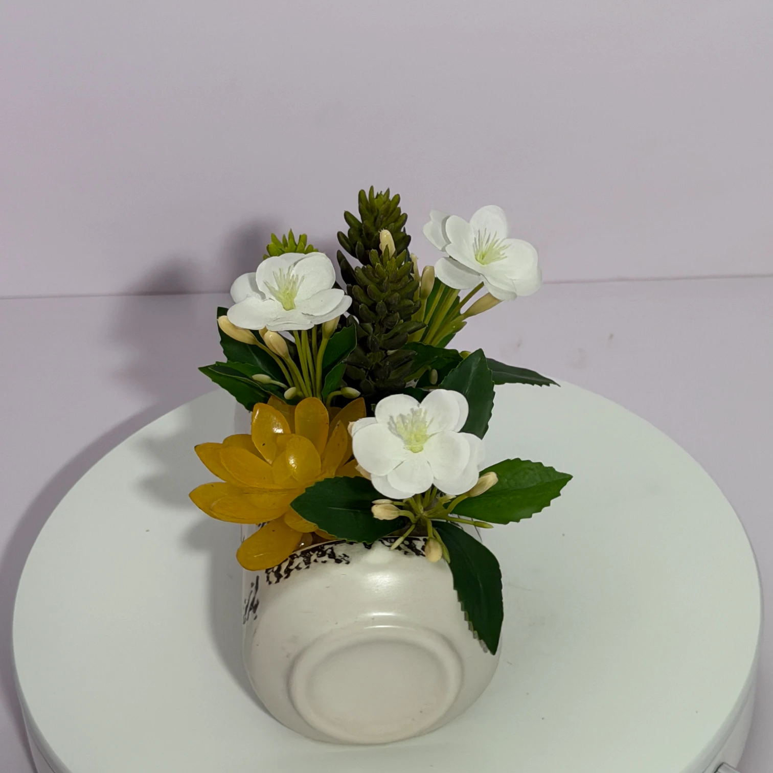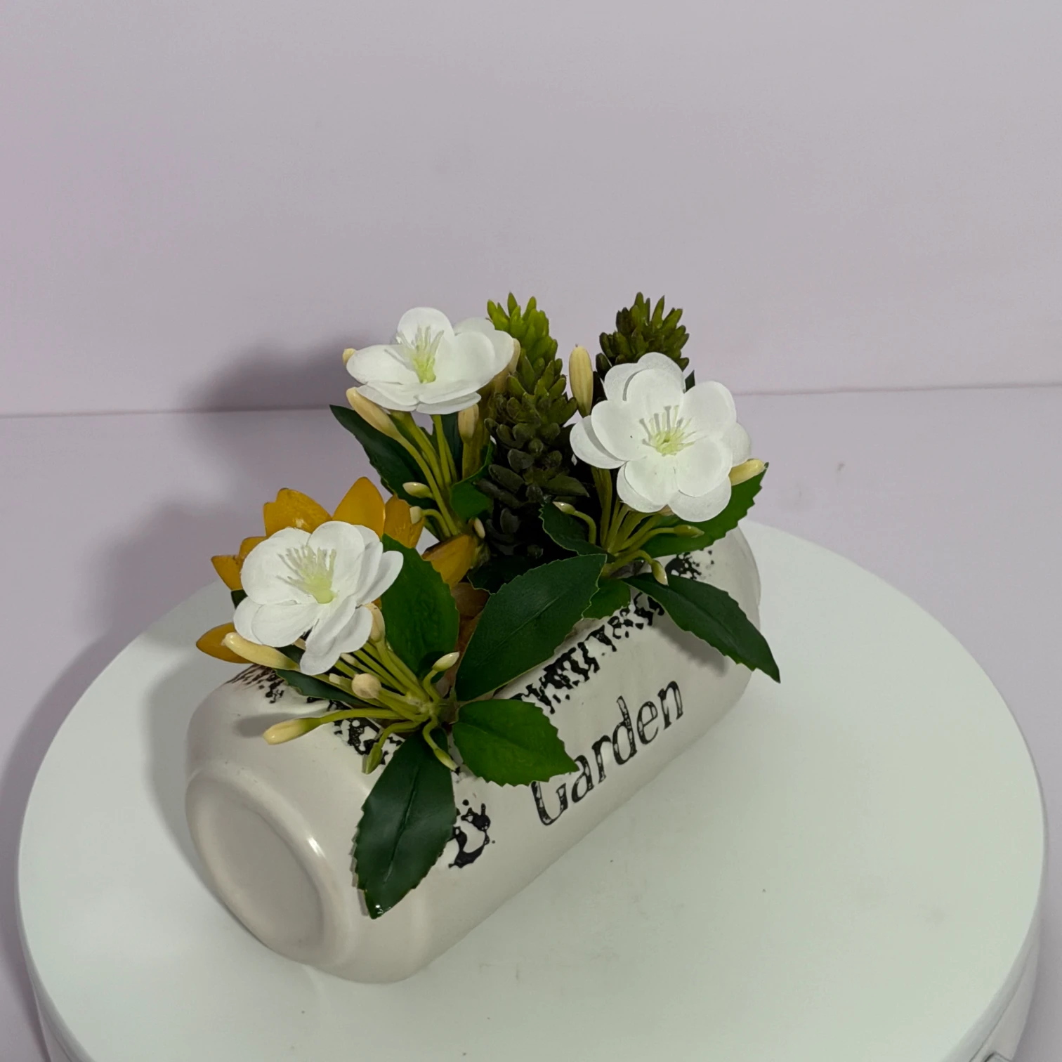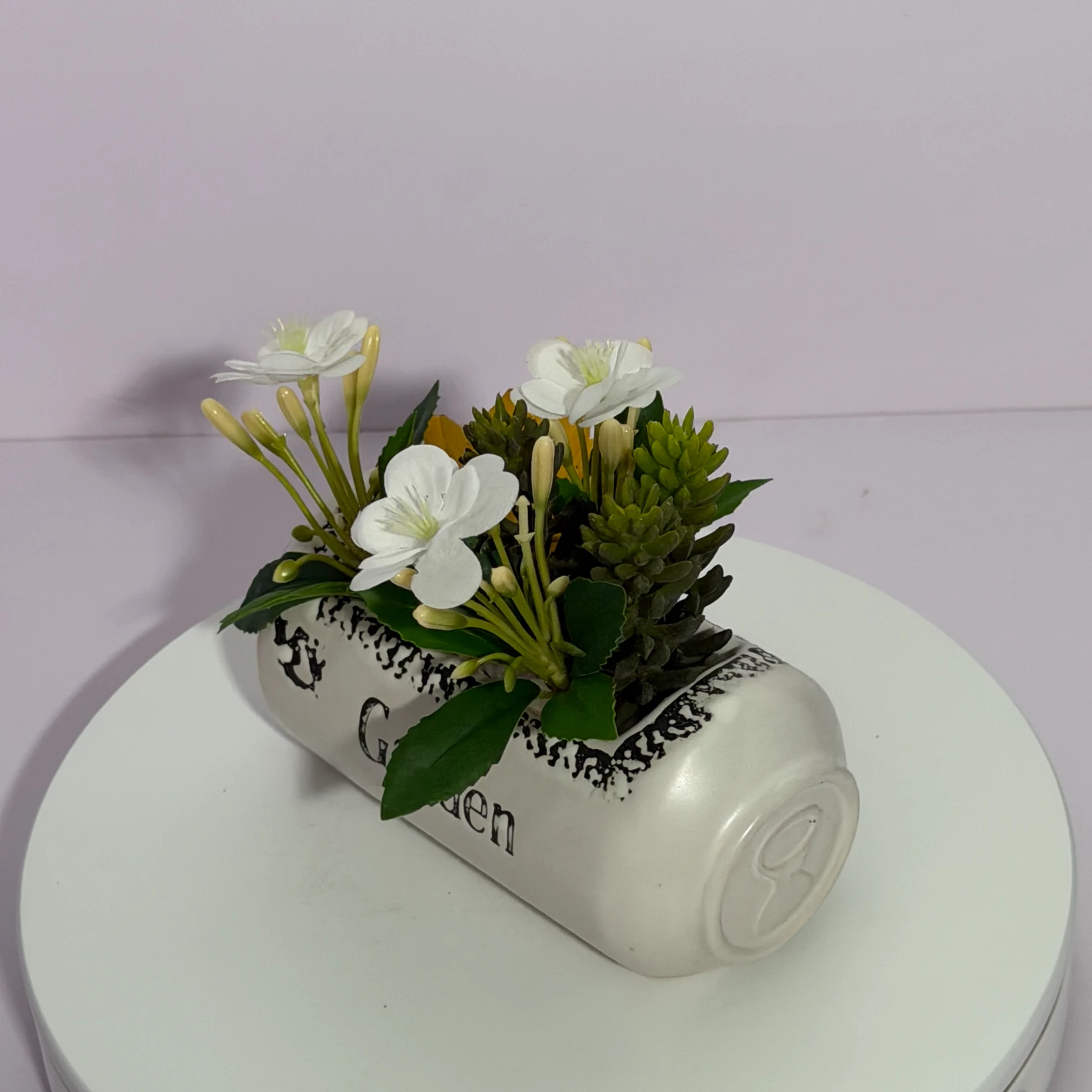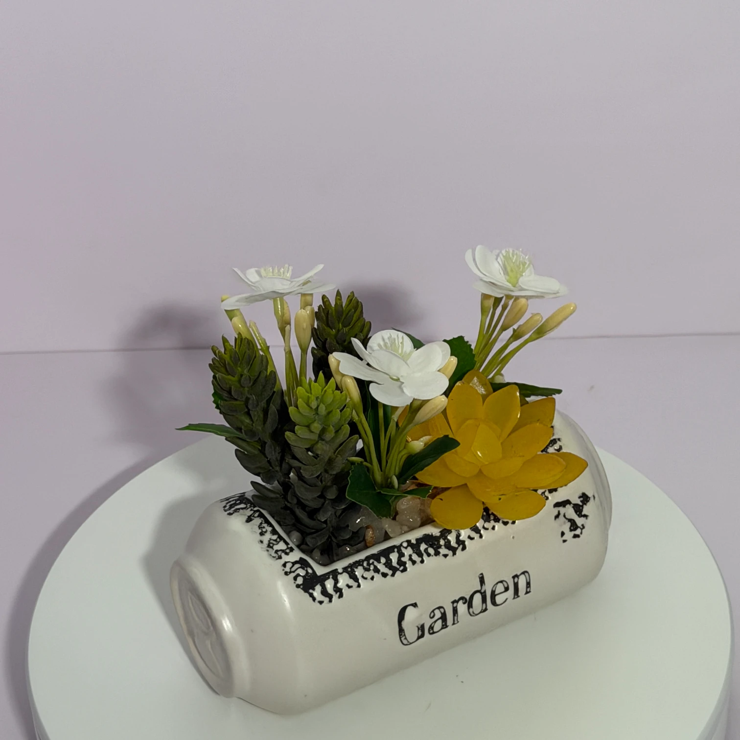 Este arreglo de plantas y suculentas artificiales combina diversas especies en tonos verdes, blancos y amarillos, incluyendo flores blancas delicadas, montado en una maceta rectangular blanca con la palabra “Garden” y detalles en negro. Totalmente artificial, no necesita riego, luz solar ni cuidados, aportando un toque de frescura y encanto rústico a escritorios, mesas o rincones del hogar.