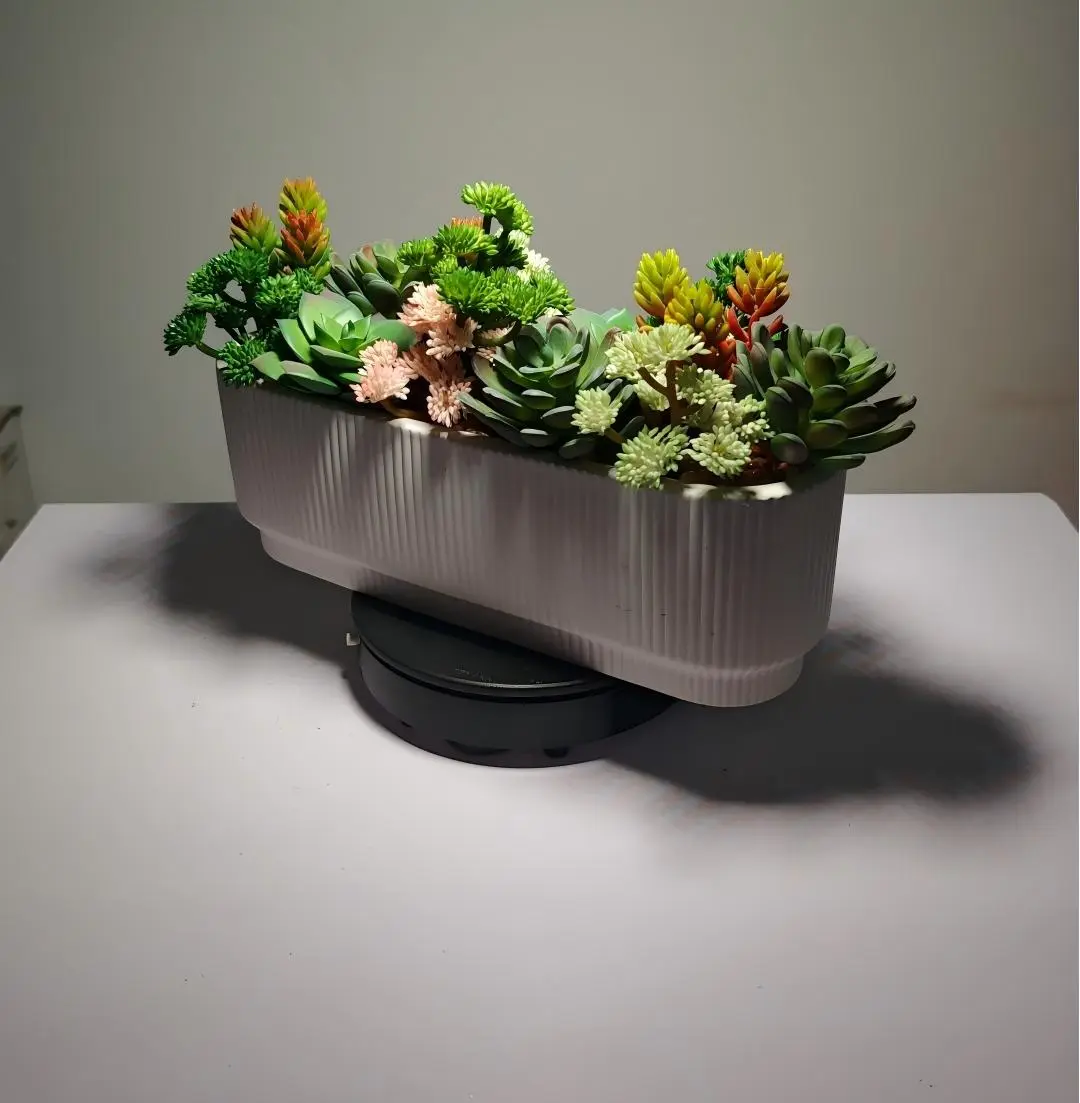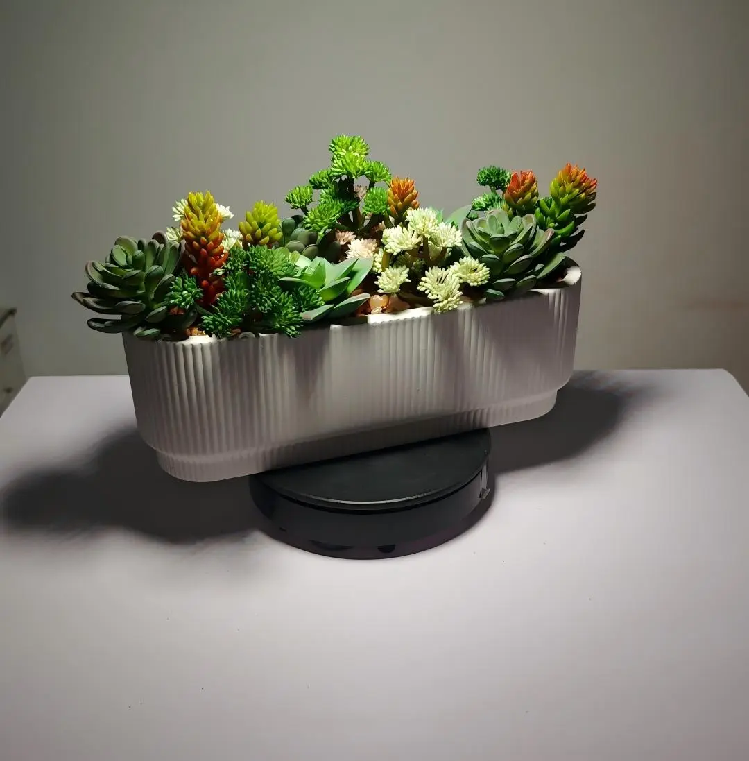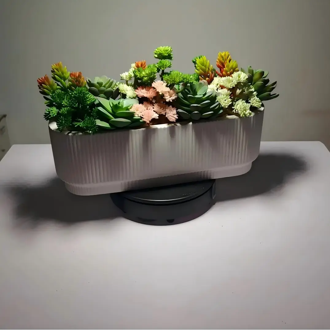 Maceta blanca acanalada, repleta de suculentas. Una paleta viva de verdes, rosas y amarillos. Hojas carnosas y delgadas se entrelazan con abundancia. Sobre una superficie gris clara. Un pequeño jardín, siempre en plenitud.