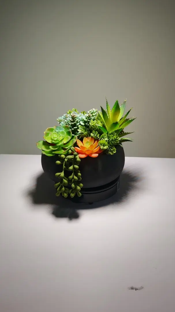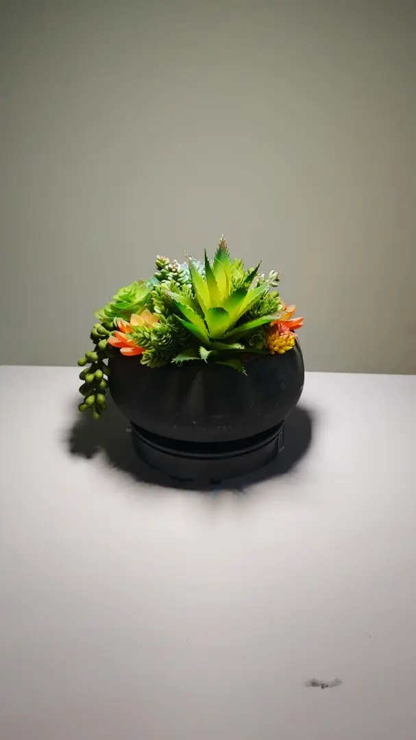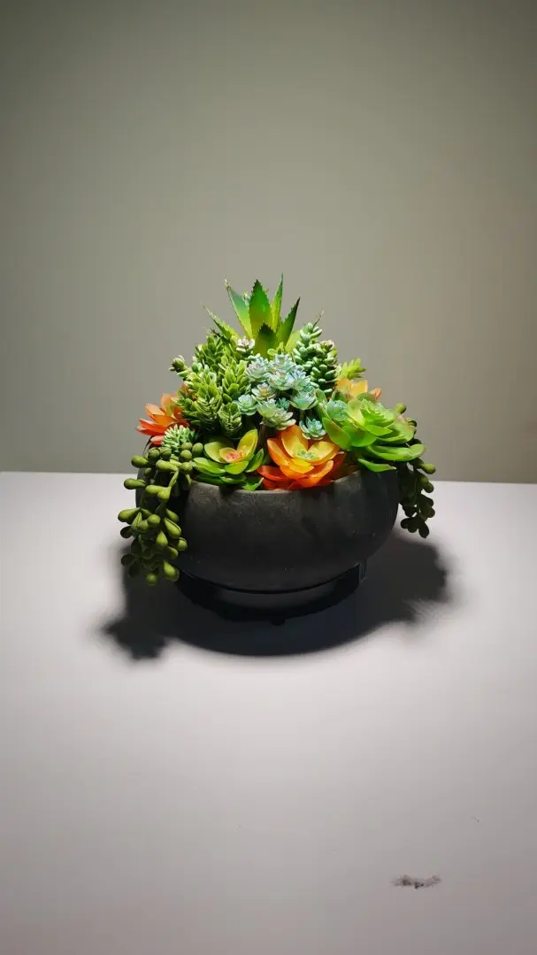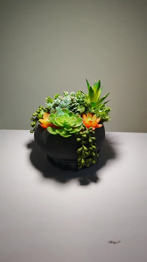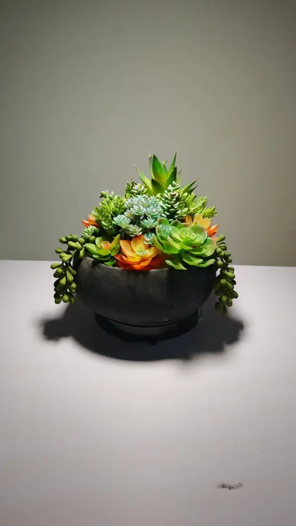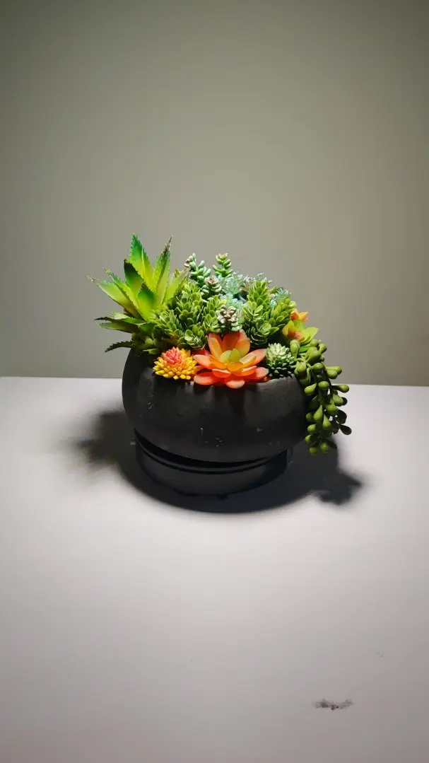 Nuestra planta artificial en maceta se integra a la perfección con la forma natural, siendo perfecta para colocar en estanterías o escritorios. Si buscas más plantas artificiales pequeñas, te sugiero que veas este arreglo; puede que te guste.