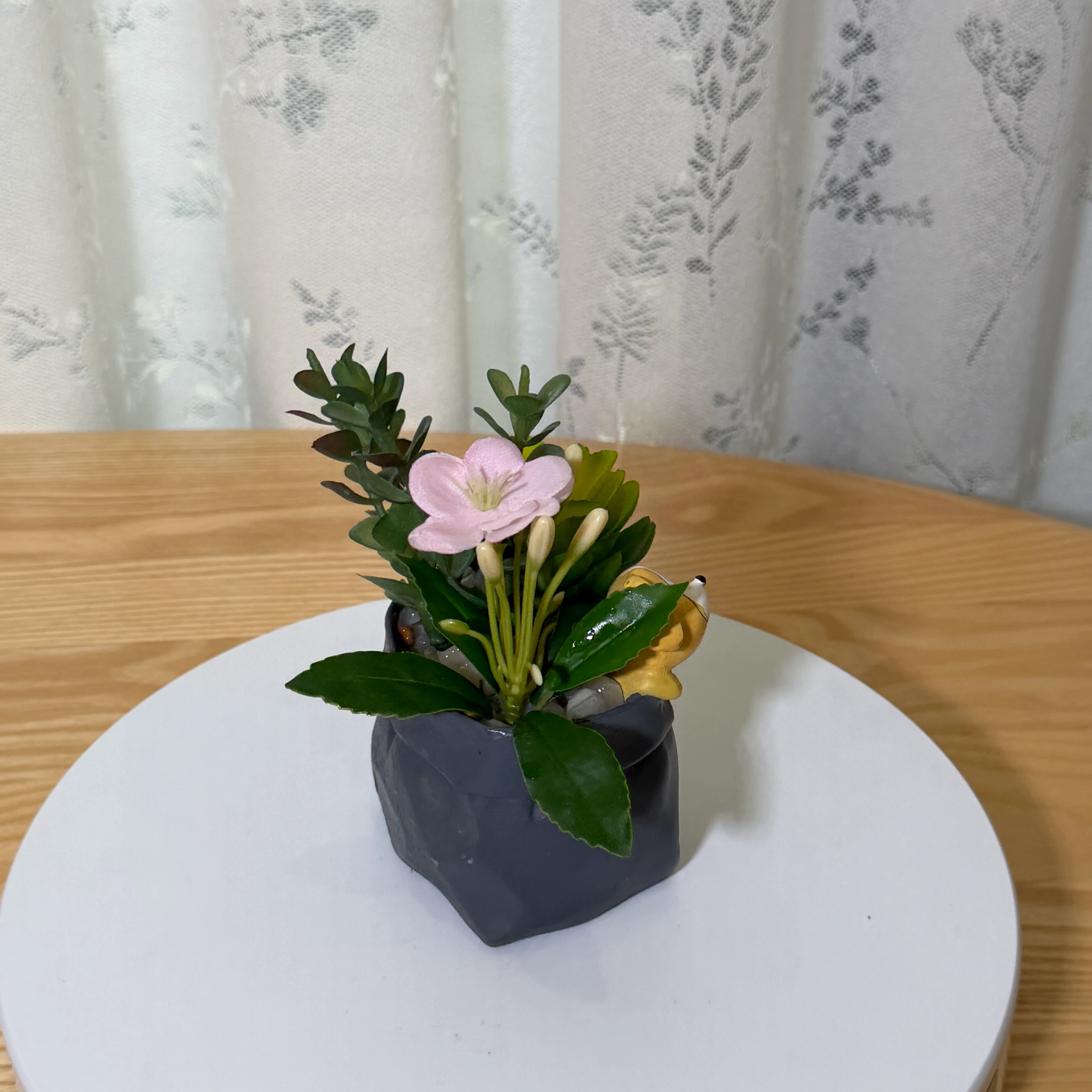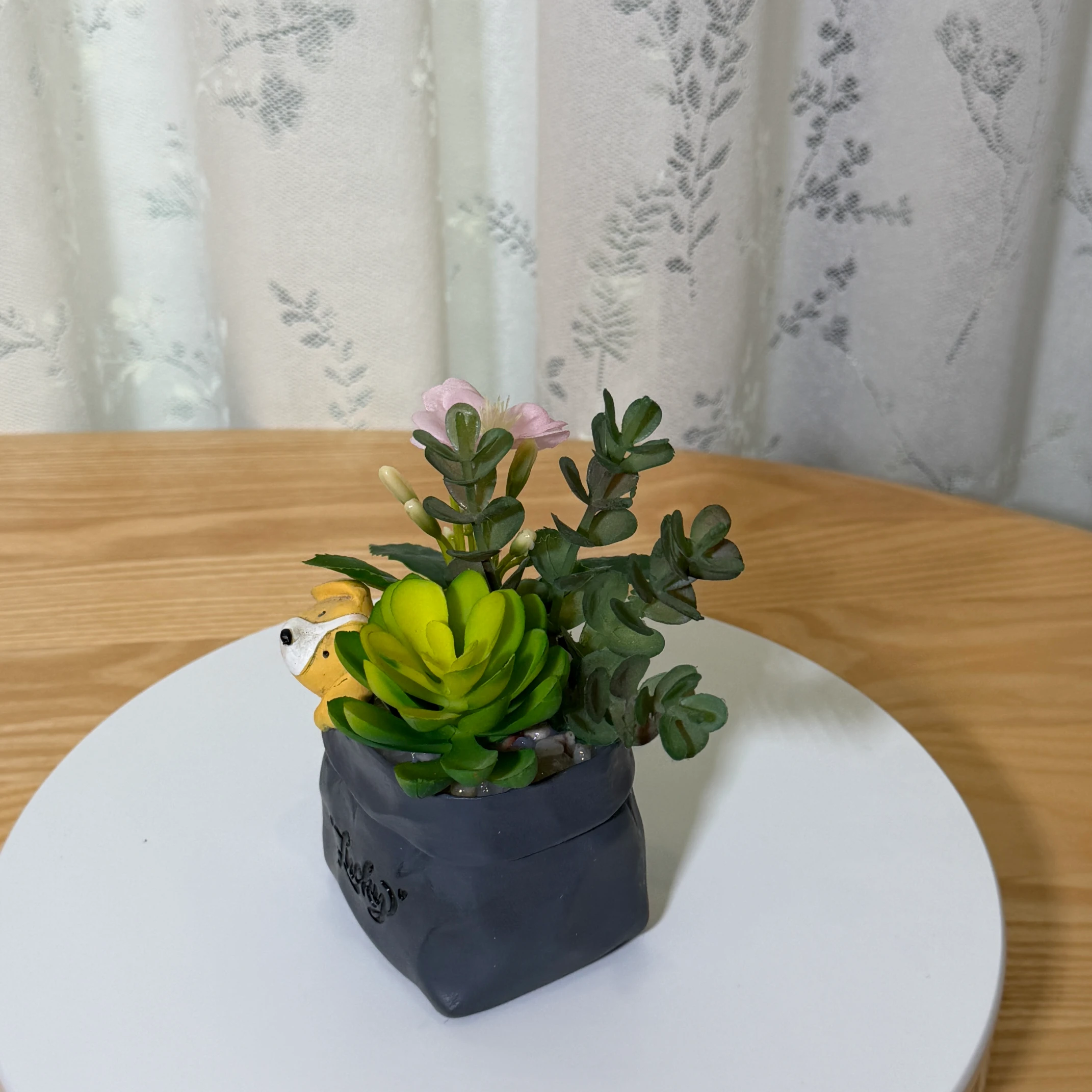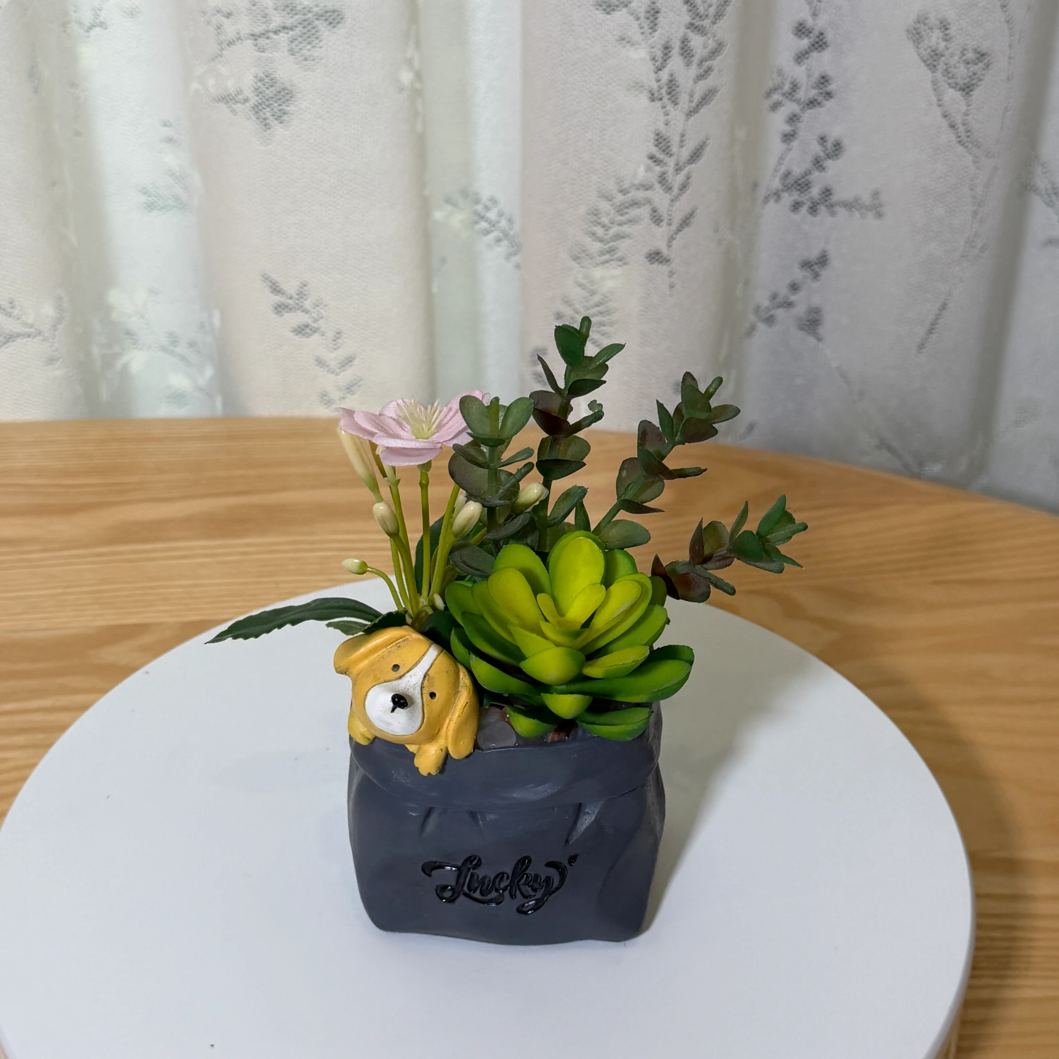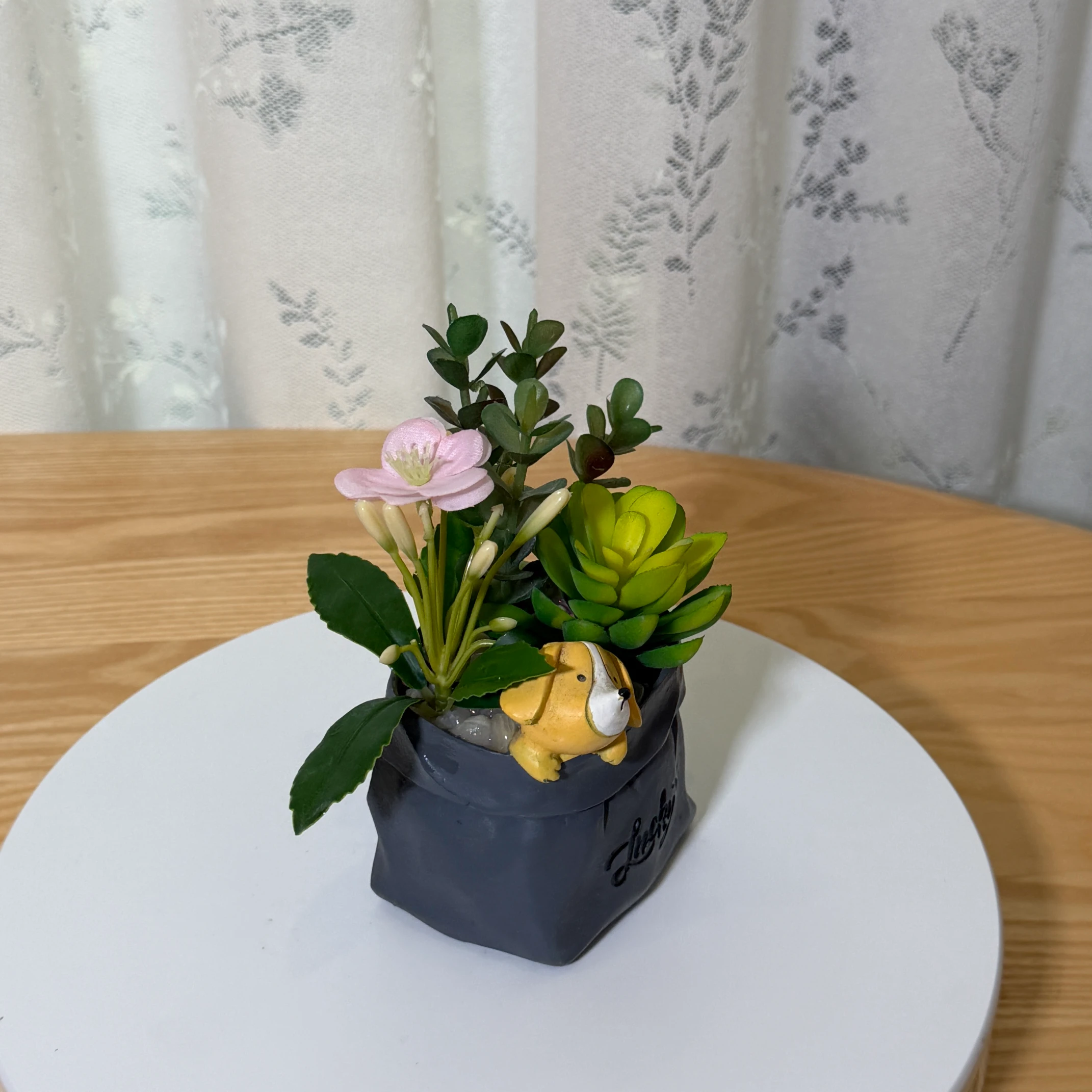 Este encantador arreglo de suculentas artificiales combina plantas verdes realistas, una delicada flor rosa y follaje texturizado. Destaca una linda figura de perro resinado de color amarillo/marrón que asoma por el borde de la maceta, junto con la inscripción “Lucky” en letras negras. La maceta tiene forma de bolsa de papel de color gris oscuro. Sin necesidad de riego ni mantenimiento, es una decoración adorable y un regalo perfecto para mesas de centro, estanterías o espacios personales que buscan un toque de ternura y frescura.