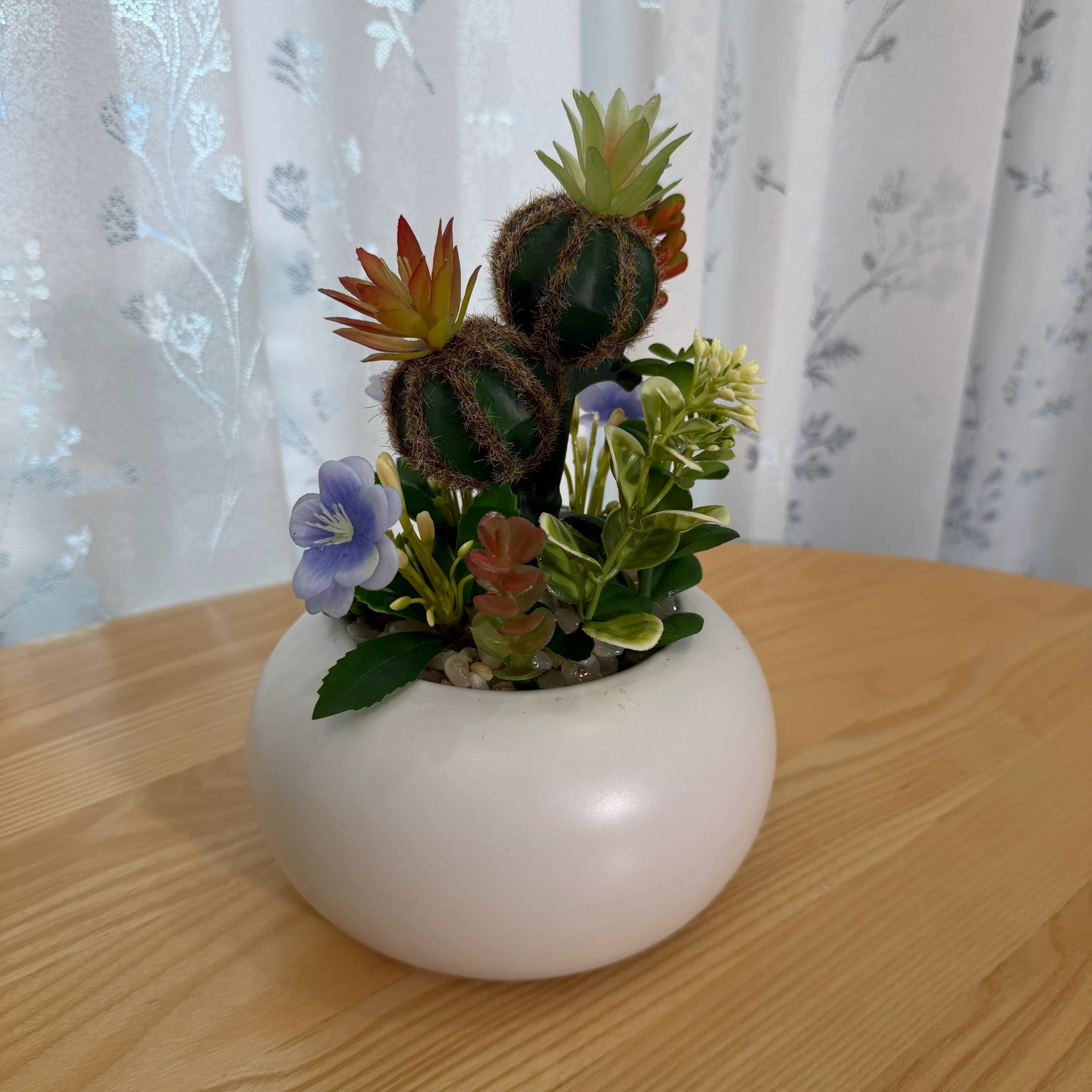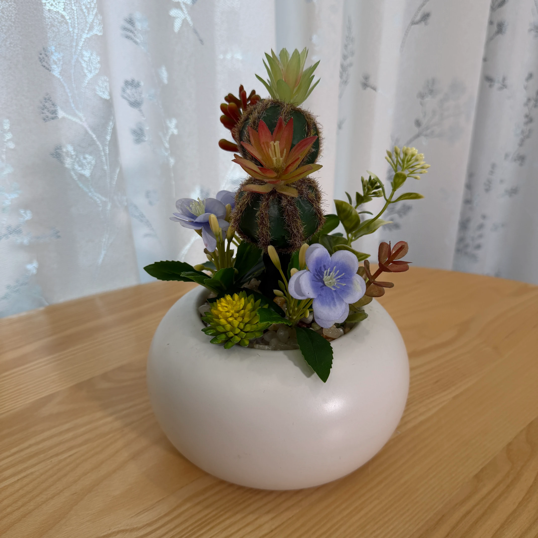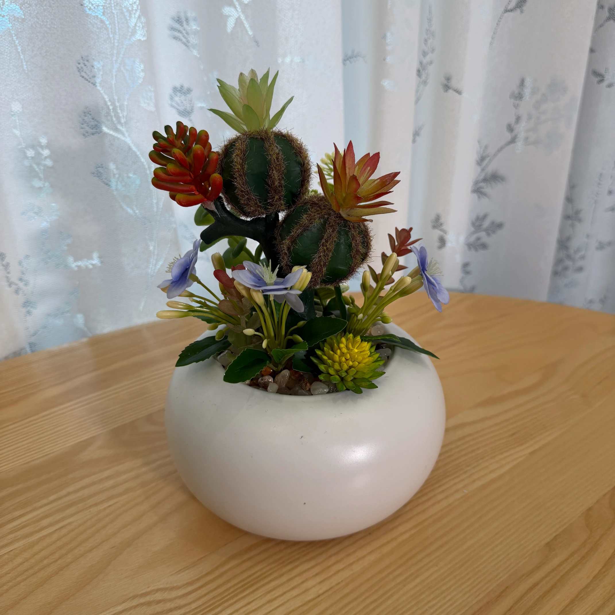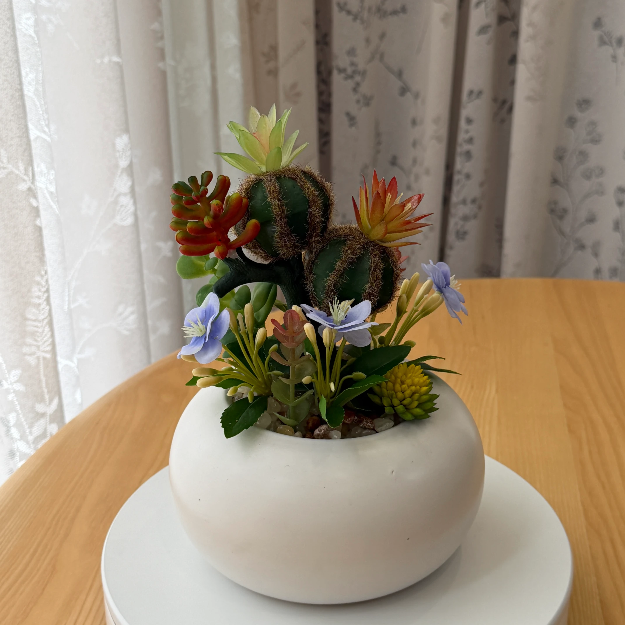Esta es una combinación de cactus y flores artificiales realista en una maceta de cerámica blanca de forma redondeada, adornada con piedras decorativas.