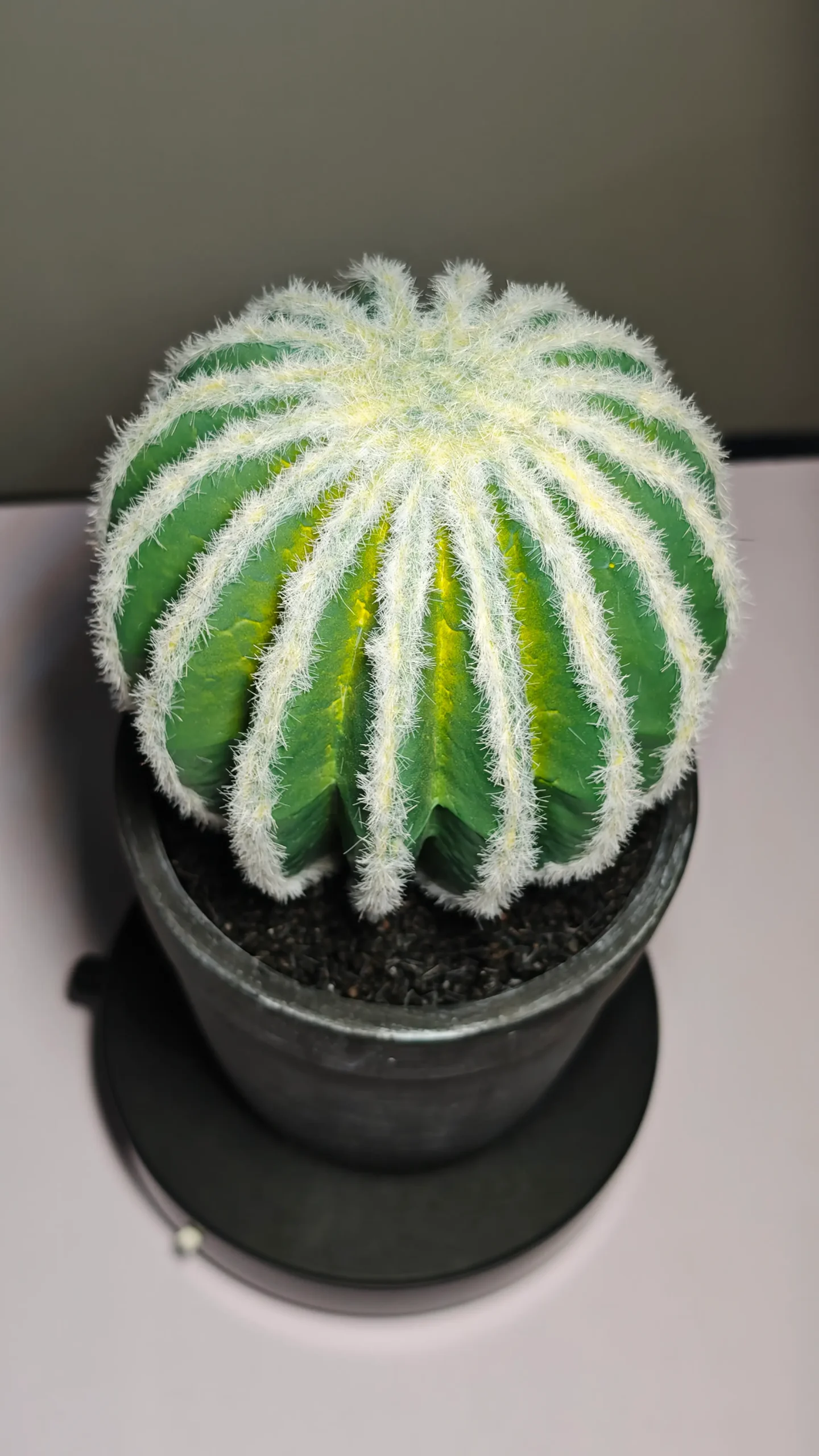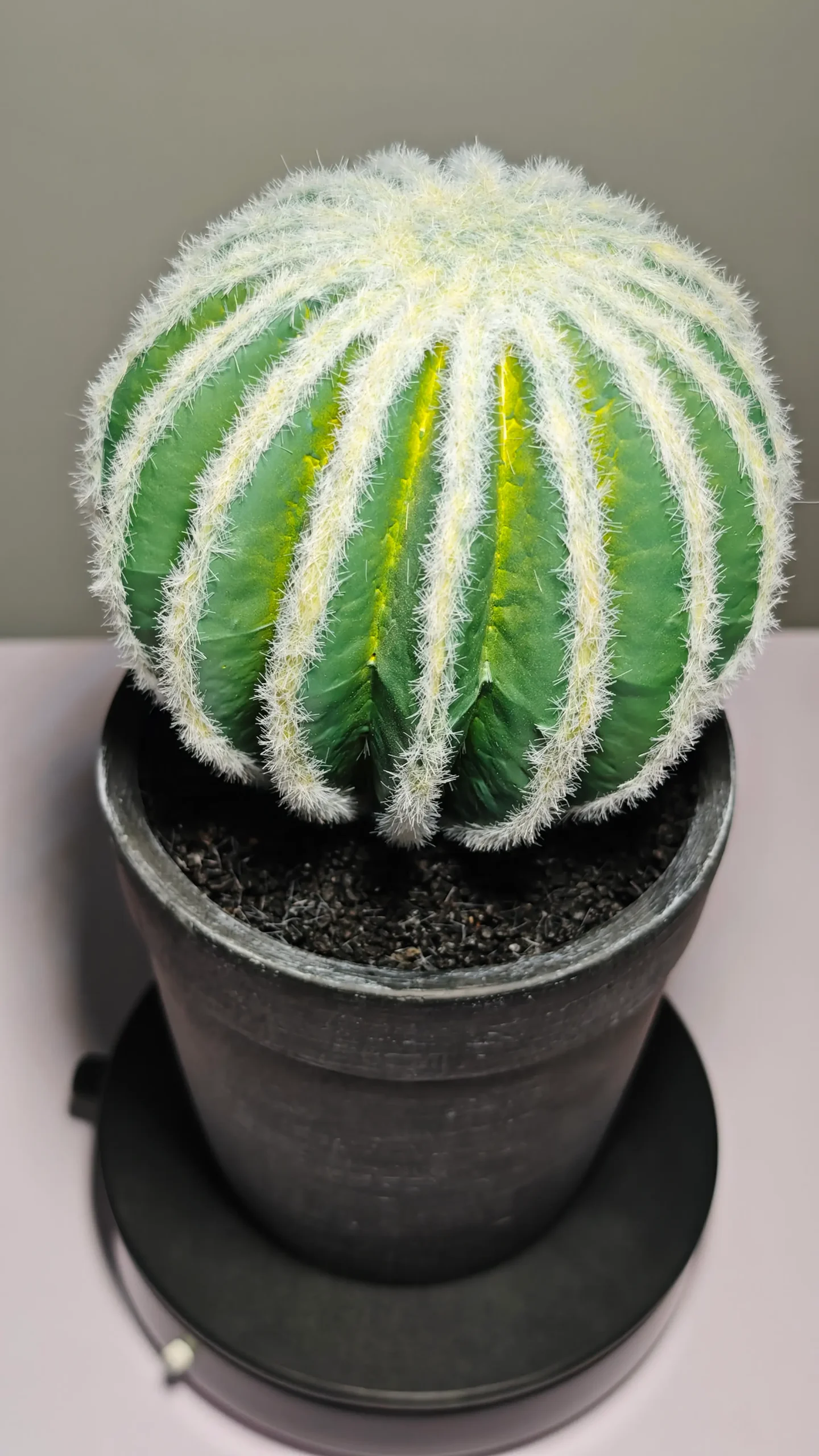 Este cactus artificial globular es una pieza decorativa elegante y llamativa, con un cuerpo de color verde vibrante y rayas blancas peludas que imitan fielmente la textura de la planta natural. Su forma redondeada y simétrica crea un punto focal visual atractivo, mientras que la maceta de cemento negro de diseño minimalista aporta un toque de modernidad.