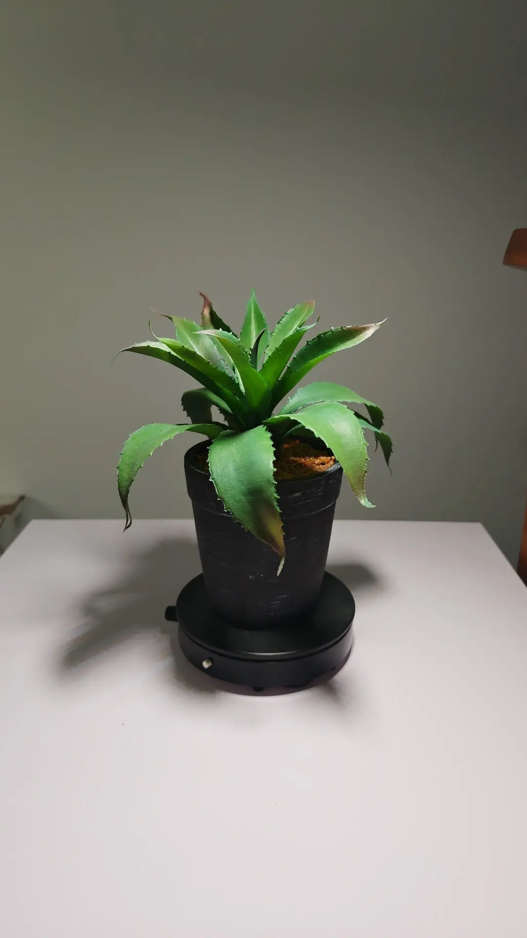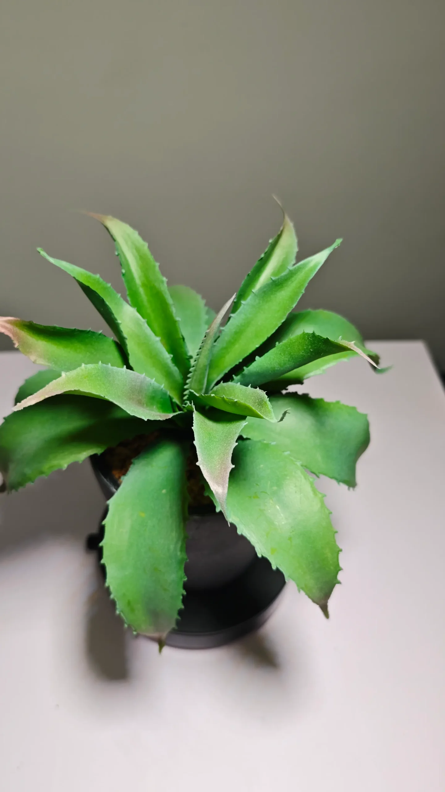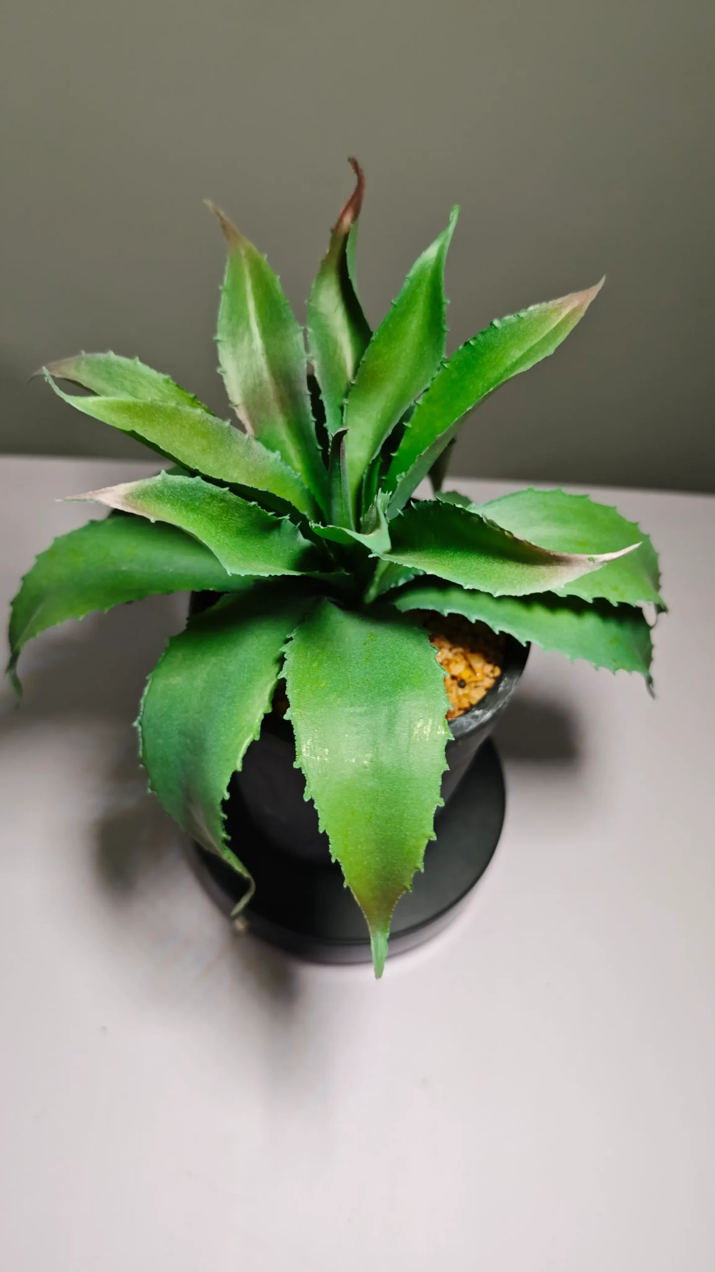 Esta planta suculenta artificial de tipo agave es una pieza decorativa llena de vitalidad, con hojas verdes profundas y bordes dentados realistas que imitan fielmente la textura de la planta natural. Su crecimiento abierto y denso crea una sensación de frescura tropical, mientras que la maceta negra de diseño minimalista aporta un contraste elegante y moderno.